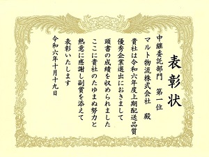 御取引先様から配送品質に対して表彰を頂きました。