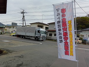 自社の車と啓発の旗をバックに写真を撮ってみました。
